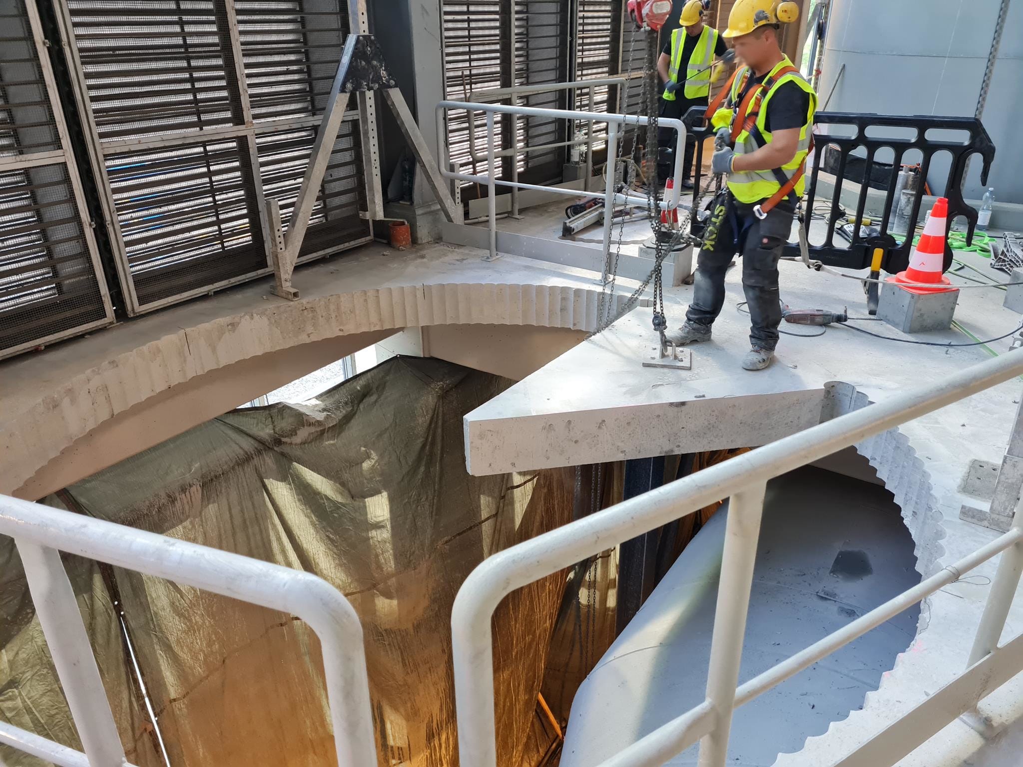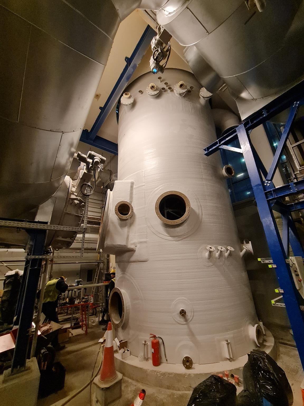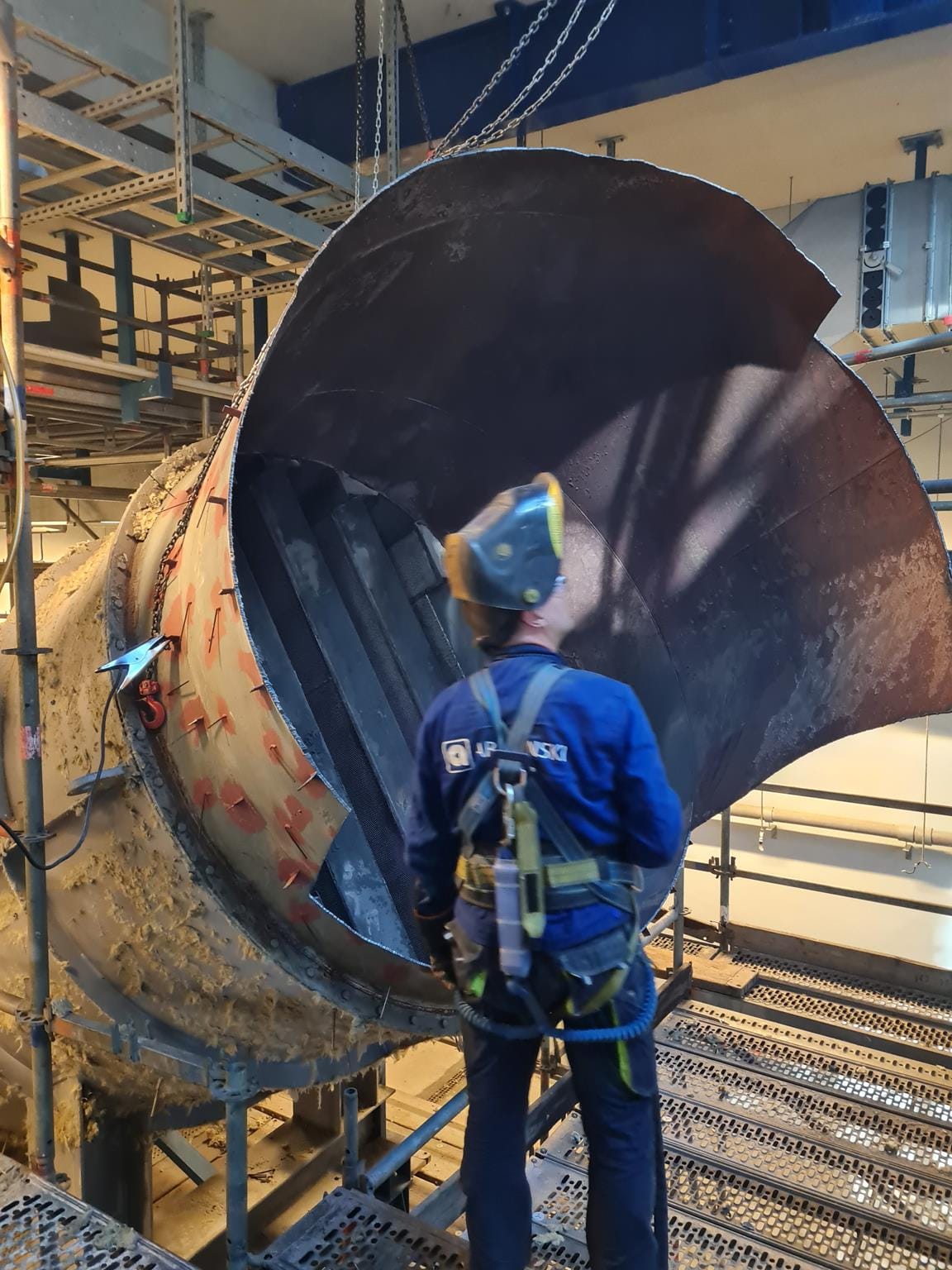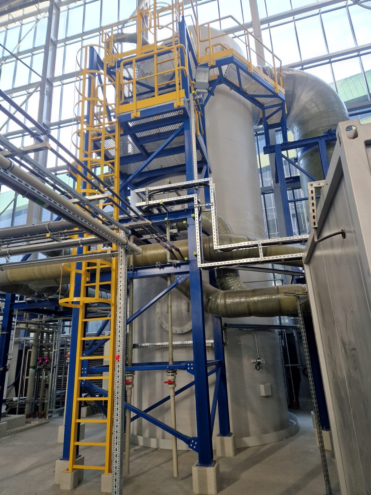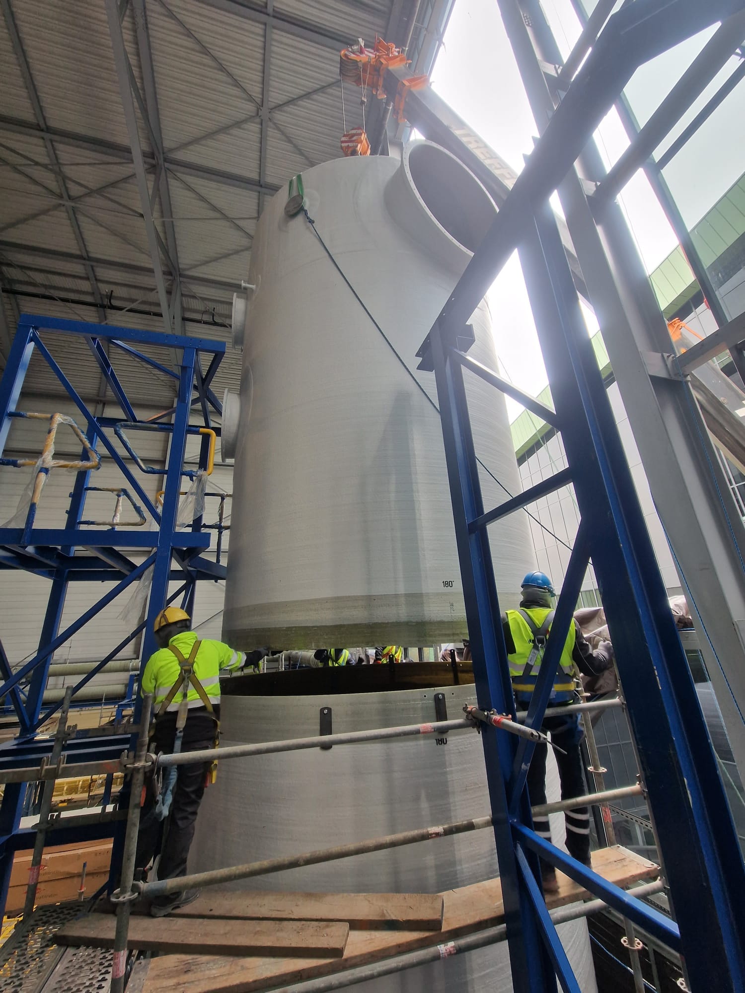 Zrealizowano prace: – wzmocnienia stropów żelbetowych – otworowanie stropów metodą cięć i odwiertów – montaże konstrukcji stalowych wsporczych i pomocniczych – montaże urządzeń wielkogabarytowych takich jak: wymienniki ciepła, zbiorniki, silniki z wentylatorami, skrubery, kanały spalin – montaże rurociągów instalacji UOC w przedziale średnic DN15-DN600 oraz kanały spalin ze stali nierdzewnej DN1600, łączna długość rurociągów około 8 tys mb – demontaże ciężkie kanałów spalin oraz wentylatorów i silników – wykonanie rurociągu ciepłowniczego stalowego pod nadzorem UDT