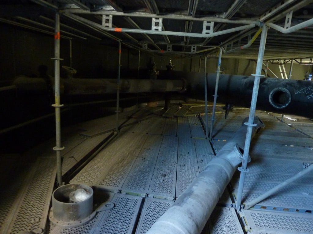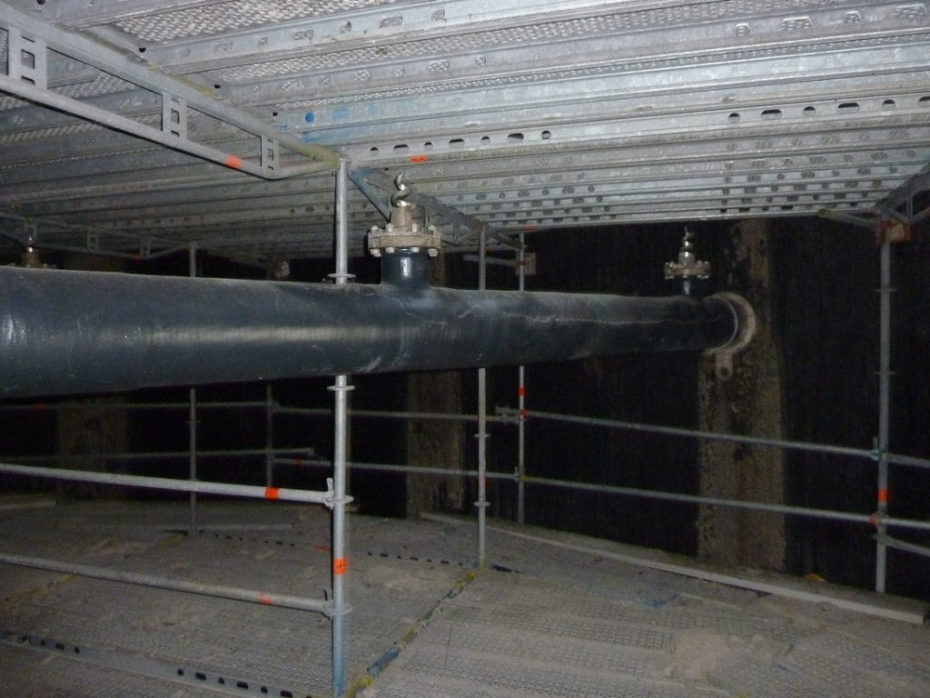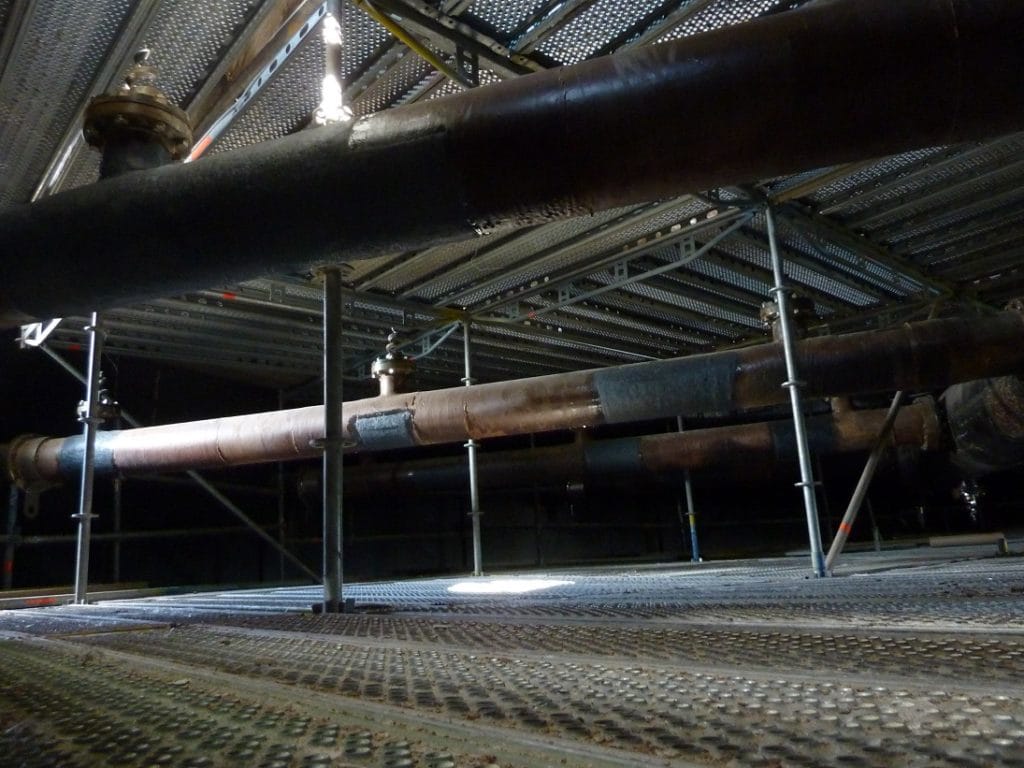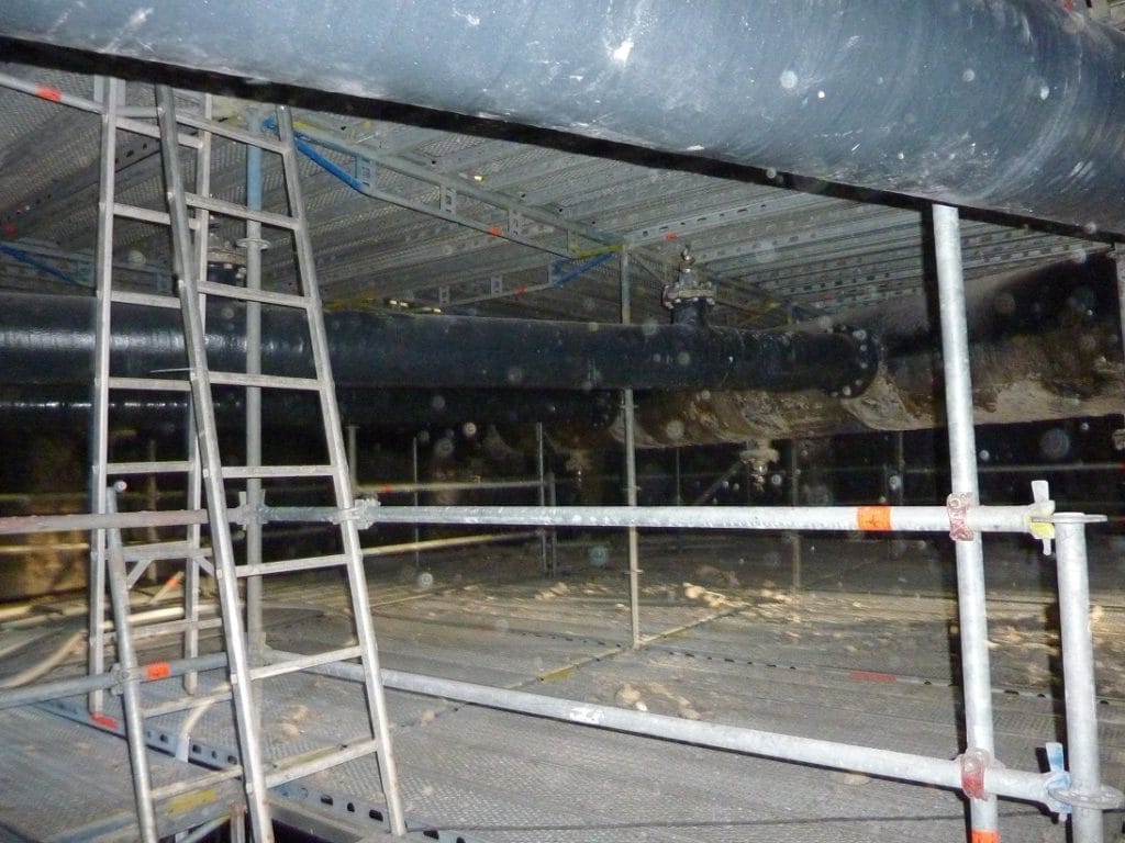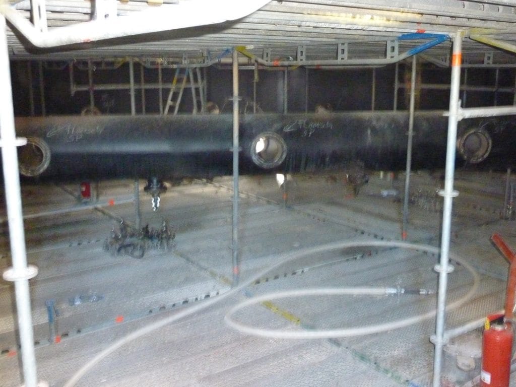 Poważny remont instalacji odsiarczania spalin. Niezbędny okazał się demontaż instalacji oraz regeneracja znacznej jej części poza absorberem lub wymiana na całkowicie nowe odcinki, (nawet 40% instalacji absorbera). Rurociągi bardzo ciężkie, od wewnątrz zapchane (zamurowane) gipsem. Realizacja w trudnych warunkach. Pełen sukces !!